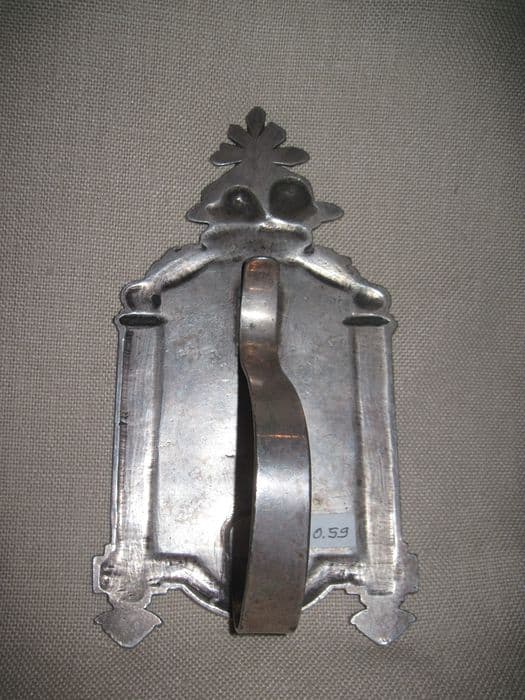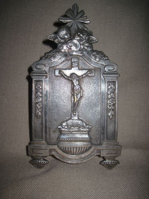 Baiser de paix, en forme d'édicule à pilastres et fronton couronné de têtes d'anges, montrant la Crucifixion reposant sur le sépulcre où gît l'agneau couché sur la croix.