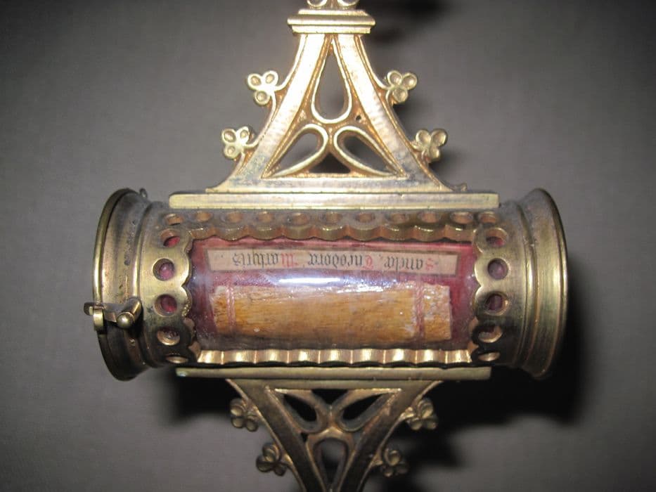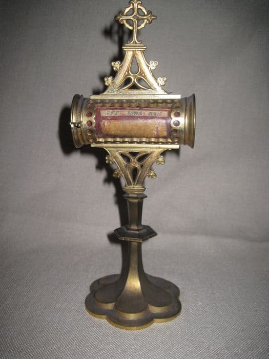Laiton, velours. Reliquaire de style néogothique, sur un pied polylobé, orné d'un noeud plat hexagonal ; le réceptacle à reliques est de forme cylindrique, allongée. La relique elle-même est un fragment de bois fixé à un petit panneau couvert de velours cramoisi.