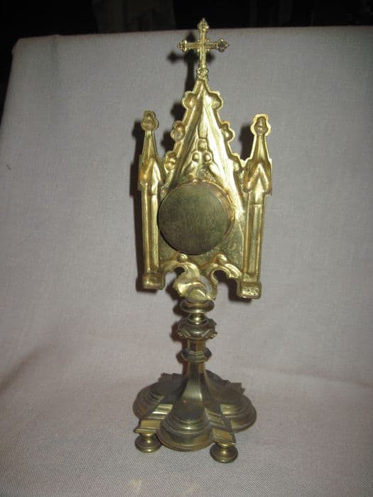 laiton, verre, papier, tissu etc (pour les reliques). Reliquaire de style néogothique, sur un pied quadrilobé reposant sur quatre petits pieds-bobine, orné d'un noeud plat circulaire à cabochons losangés ; le réceptacle à reliques est de forme circulaire à fenêtre polylobée ; il est inclus dans un encadrement à motifs de gables et de pinacles. Les reliques sont incluses dans des petits pendentifs et sont relatives à la vraie Croix, au sepulum, et à Marie- Madeleine Alacoque.