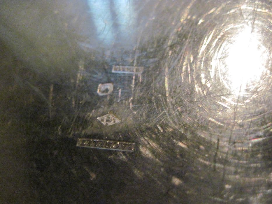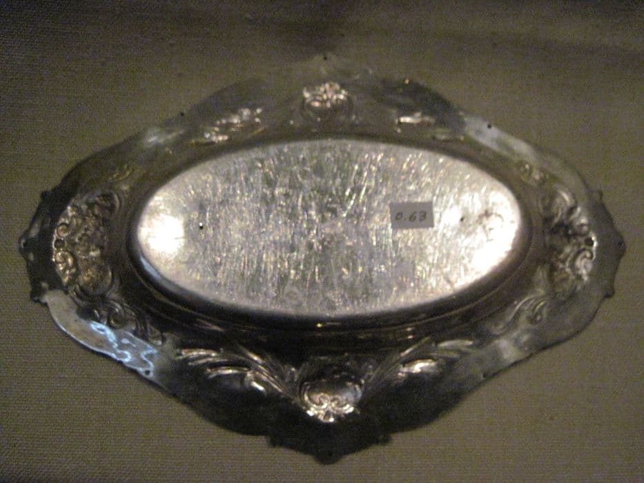 Plateau à bords chantournés de style Louis XV, orné sur l'aile de pampres et de médaillons accostés de roseaux, frappés des lettres M.R. Sous le plateau : Bachelier à Paris. Description des burettes manquantes : ornées sur la panse de roseaux accostant un médaillon figurant la Vierge d'une part, et d'autre part le Christ. Anse sinueuse, couvercle décoré de pampres et d'un coquillage (source : Guilbaud).