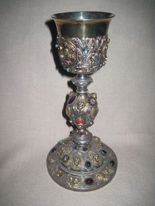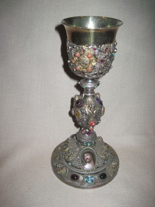 Argent, argent doré (coupe), verre coloré, cristal, agate (?), pierre précieuse (?). Calice à noeud ovoïde et fausse coupe découpée et repercée, orné sur le pied et le noeud de têtes d'anges ; sur la fausse coupe des bustes du Christ, de la Vierge et du Sacré Coeur dans des médaillons entourés de pampres, épis de blé et roseaux. Sur le pied, médaillons fleuris émaillés et tête de Christ couronné d'épines. Décor abondant sur tout le calice de gros cabochons, les uns à facettes.