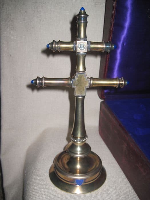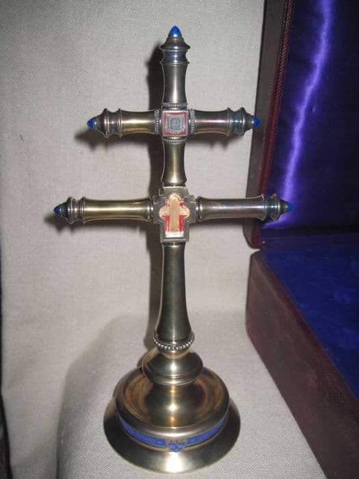 Croix archiépiscopale, dans sa boîte, de section circulaire. Elle est ornée de perles au-dessus du pied et à l'intersection de la seconde traverse ; frappée d'un carré à fond émaillé rouge présentant le voile de sainte Véronique d'un côté et de l'autre une fleur, d'une capsa à l'intersection de la première traverse, à ouverture trilobée, contenant sur un fond de tissu rouge deux éléments de bois formant croix surmontant un petit cartel de papier. Les extrémités des branches sont ornées de bobèches se terminant par un cabochon de verre bleu. Dans sa boite d'origine.