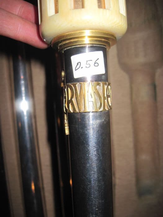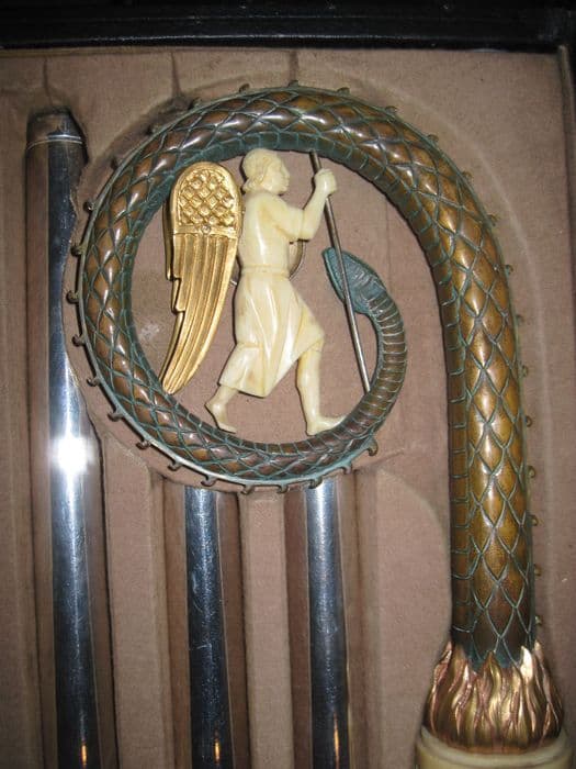 Crosse de style néogothique dans sa boîte en 4 éléments. Laiton argenté (hampe), laiton doré (noeud), laiton patiné (volute) ; laiton nickelé (bouclier) ; ivoire (noeud, saint Michel) ; émail (armoiries).