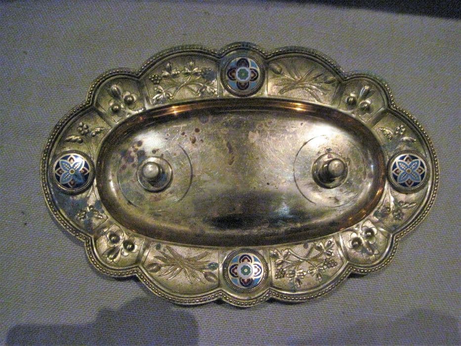 Plateau et burettes dans leur boîte. Plateau polylobé orné sur l'aile de quatre médaillons émaillés à décor de quadrilobes et de pampres et roseaux. Burettes à récipient en verre gravé à l'acide de pampres, à anse en forme d'enroulement feuillagé et couvercle terminé par un fretel.