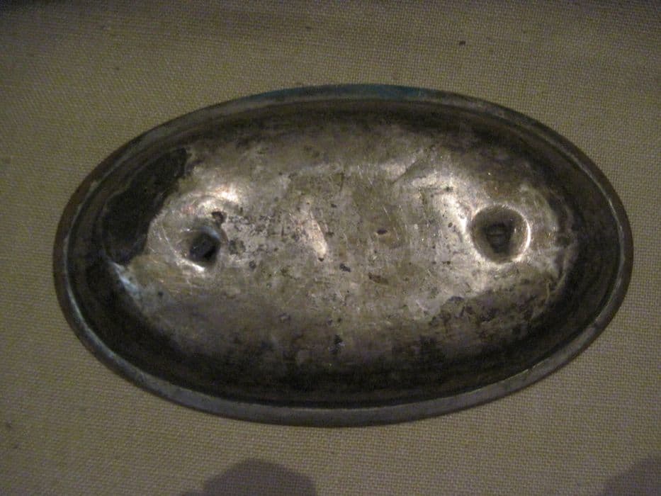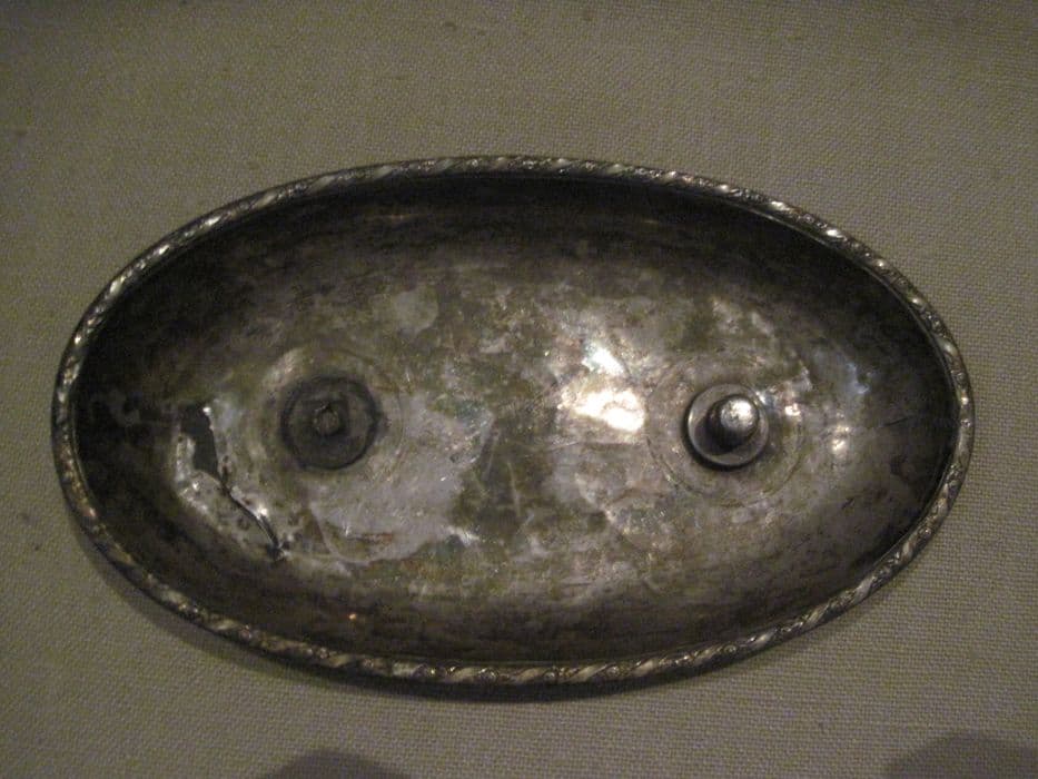 Plateau à burettes à décor de torsade sur le pourtour. Métal blanc (fer ou étain). Les burettes sont manquantes.