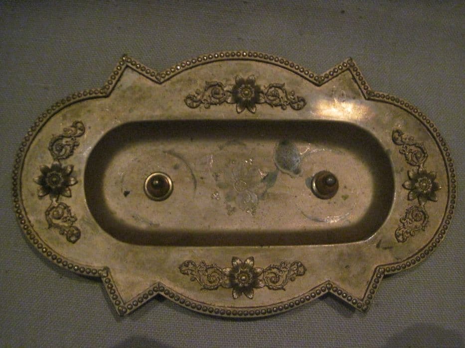 Plateau à burettes au pourtour découpé alternant lobes et pointes soulignés d'un rang de perles ; au milieu des côtés, motif rapporté de rinceaux encadrant des fleurs à huit pétales. Les burettes sont manquantes.
