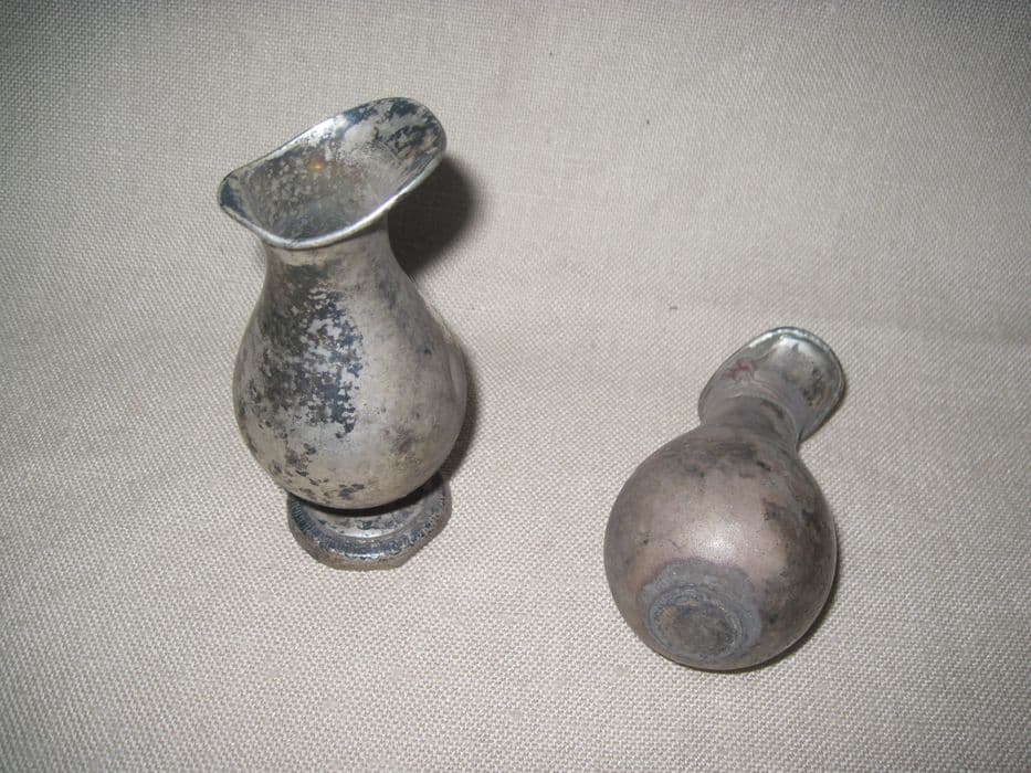 Métal blanc. Paire de burettes fragmentaires. Simple décor de rang de feuilles sur le pied.