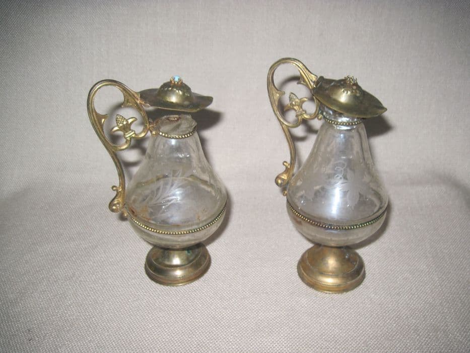 Paire de burettes à anses s'achevant en fleur de lys dans l'enroulement, ceinture à rang de perles et couvercle à motif de pampres de vigne ; les récipients sont en verre gradé à l'acide (pampres de vigne, roseaux).