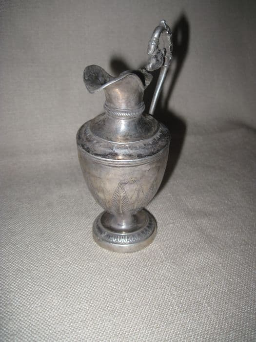Métal blanc. Burette à anse feuillagée s'achevant en corne d'abondance, motifs de rangs de feuilles sur le pied, la base et l'épaule, motif de corde autour du col.