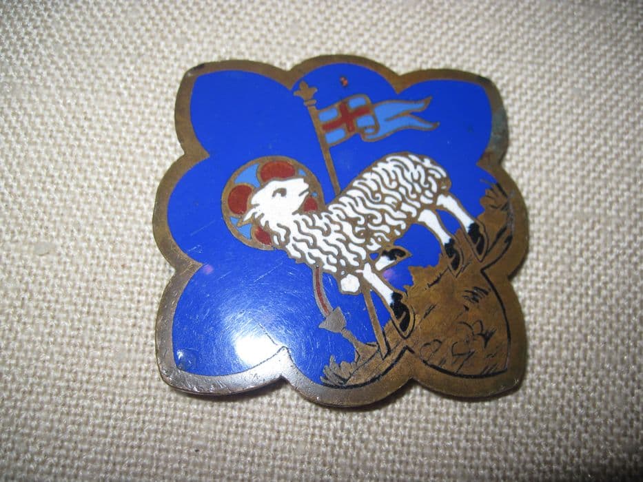 Écusson polylobé de forme losangée figurant l'agneau auréolé. Au revers, deux anneaux de fixation dont un cassé.