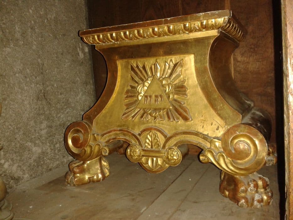 Support quadripode reposant sur des griffes de lion, galbé sur les côtés, accostés de consoles. La façade chantournée est ornée d'un médaillon frappé d'une feuille de chêne, sous le signe de la Trinité se détachant sur une gloire, et d'oves et dards sous le plateau. Support de tabernacle ?