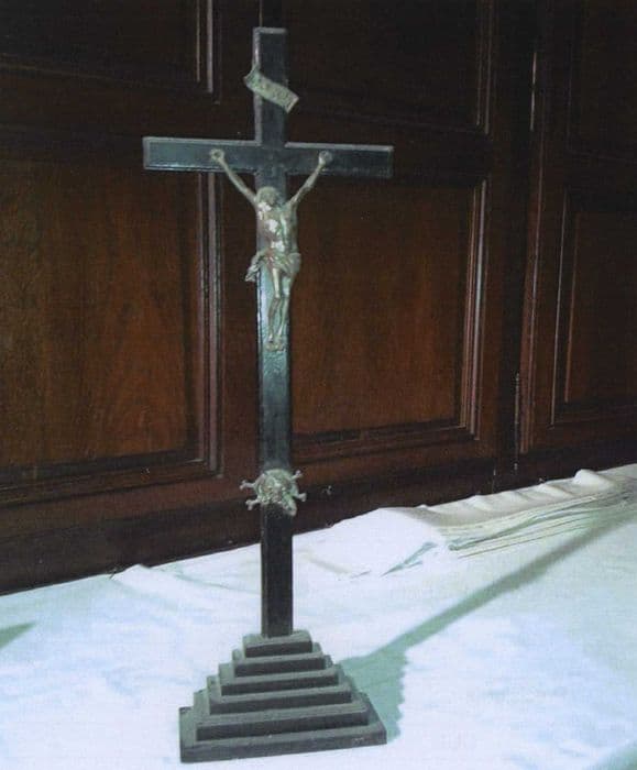 Crucifix en bois à base à motif de degrés ; sur le fût de la croix les ossements d'Adam, le Christ et le phylactère INRI en métal rivetés.