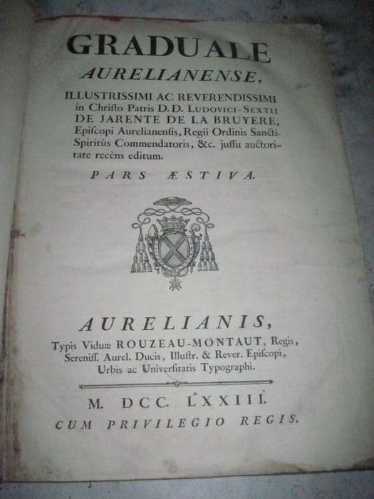 livre liturgique : Graduale aurelianense, illustrissimi ac reverendissimi in Christo Patris D.D. Ludovici-Sextii de Jarente de la Bruyere, episcopi aurelianensis, regii ordinis sancti spiritus commendatoris, & c. jussu & auctoritate recens editu. Pars aestiva