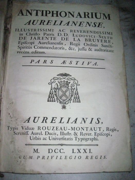 livre liturgique : Antiphonarium aurelianense, illustrissimi ac reverendissimi in Christo Patris D.D. Ludovici-Sextii de Jarente de la Bruyere, episcopi aurelianensis, regii ordinis sancti spiritus commendatoris, & c. jussu & auctoritate recens editu. Pars aestiva
