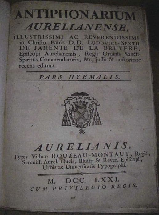 livre liturgique : Antiphonarium aurelianense, illustrissimi ac reverendissimi in Christo Patris D.D. Ludovici-Sextii de Jarente de la Bruyere, episcopi aurelianensis, regii ordinis sancti spiritus commendatoris, & c. jussu & auctoritate recens editu. Pars hyemalis.