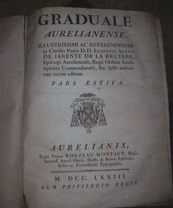 livre liturgique : Graduale aurelianense, illustrissimi ac reverendissimi in Christo Patris D.D. Ludovici-Sextii de Jarente de la Bruyere, episcopi aurelianensis, regii ordinis sancti spiritus commendatoris, & c. jussu & auctoritate recens editu. Pars aestiva.