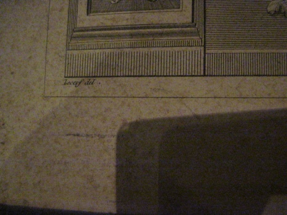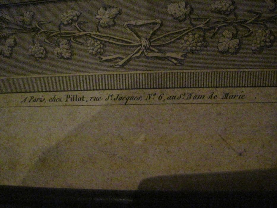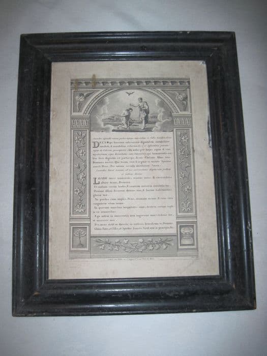 Gravure en noir dans un cadre en bois noirci. Texte dans un encadrement architecturé de style néoclassique à pilastres ornés de guirlandes de fleurs, avec en partie supérieure le baptême du Christ. Cadre du 19e siècle à simples moulures de bois noirci. Le texte commence par : Sacerdos infundit vinum