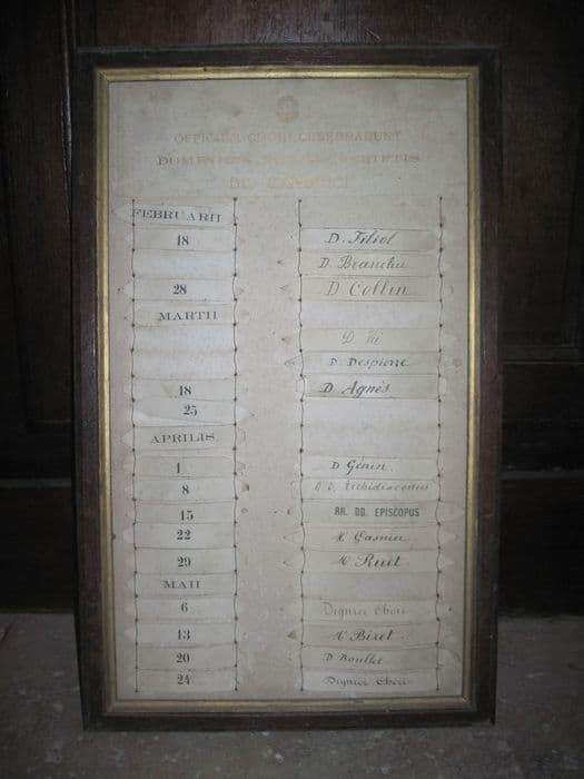 Calendrier fixant les maîtres de choeur. Panneau de papier comportant des languettes portant le jour, le mois et des noms.