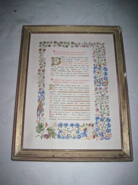 Gravure en couleur en manière de texte enluminé à bordure de végétaux et d'oiseaux. Baguette de bois doré.