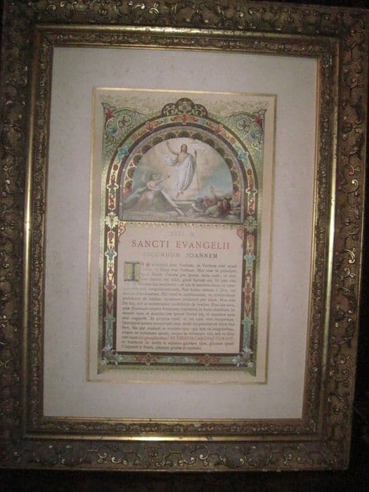Lithographie en couleur et dorée, dans un cadre en bois doré à motifs de style rocaille, passe-partout, sous-verre. La Résurrection du Christ dans une lunette surmonte le texte ; riche encadrement de rinceaux feuillagés.