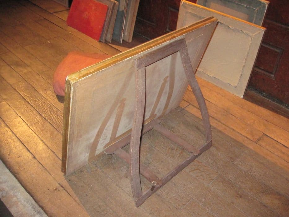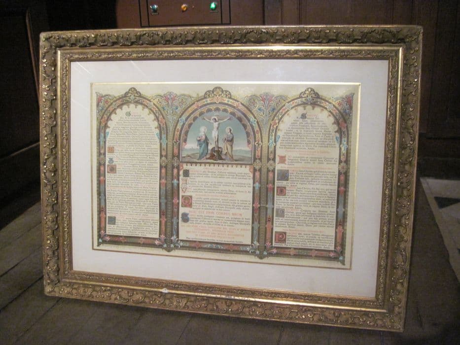 Lithographie en couleur dans un cadre en bois doré à motifs de style rocaille, passe-partout cartonné et verre ; la gravure présente un triptyque de style néo-renaissance composé de trois baies en plein cintre, la baie centrale est sommée dans la lunette d'une Crucifixion avec la Vierge et saint Jean.