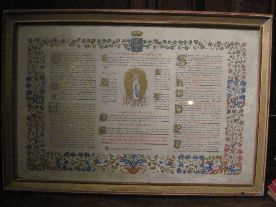 Lithographie polychrome et dorée dans un cadre en bois doré mouluré ; au centre, la Vierge dans une gloire ; des lettrines ponctuent le texte réparti sur trois zones, entouré de guirlandes de fleurs.