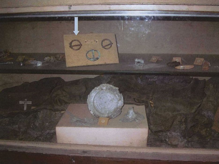 Dans la sacristie de la cathédrale, rez-de-chaussée, 2e salle, placards n° 9-10 bas, vitrine iférieure consacrée aux fouilles archéologiques de 1937.