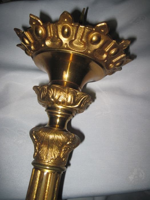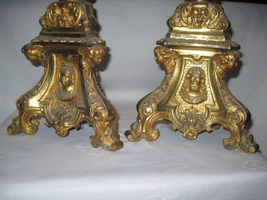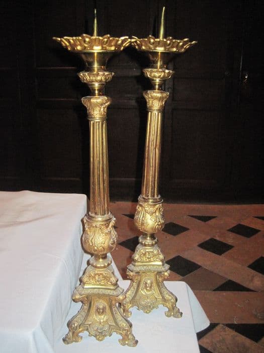 Grands pique-cierge formant paire, à piédestal tripode orné aux angles d'enroulements de feuilles sommées de têtes d'angelots et au centre de têtes de la Vierge, du Christ et d'un saint homme ; sur le noeud de guirlandes de fruits et de cartouches à miroirs sur fond natté ; le fût est cannelé et s'achève par une couronne de draperie, une couronne de feuilles et une couronne de cartouches à miroirs découpés.