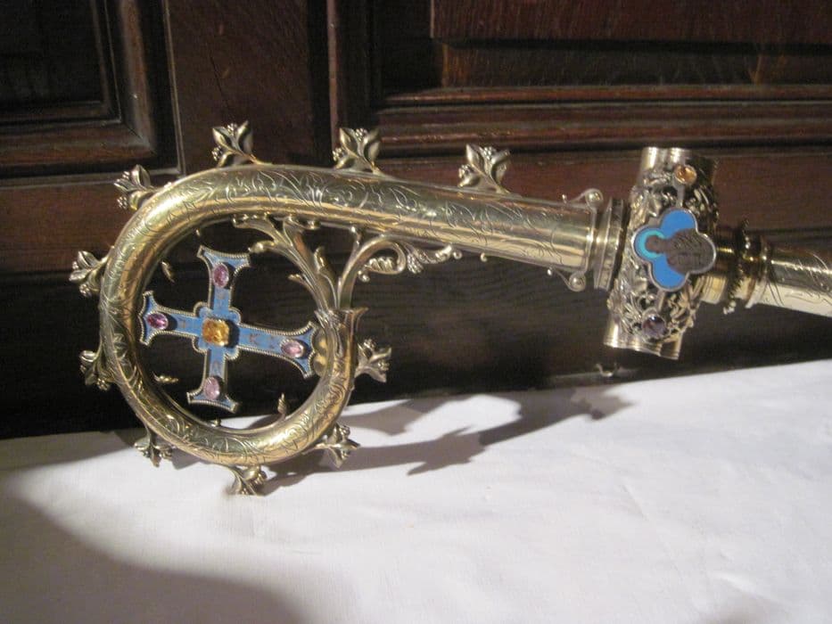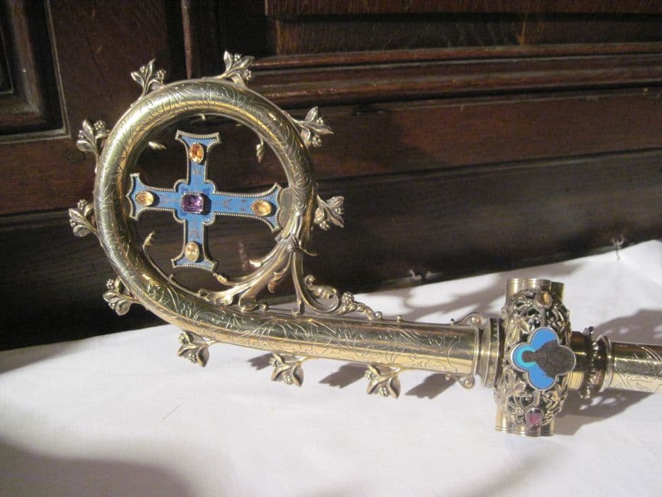 Crosse d'évêque à hampe incisée de feuilles, noeud et volute ornés d'émaux sur fond bleu, quadrilobe à buste d'évêque et dans la volute une croix ansée à décor de cabochons jaune et violet, volute ponctuée de feuilles.
