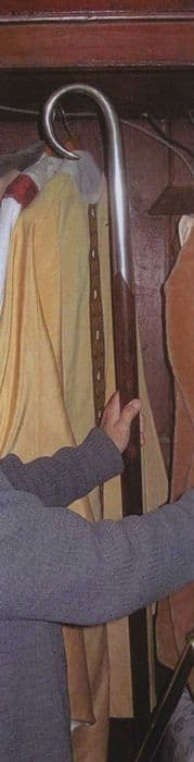 Grande crosse d'évêque à hampe de bois et simple volute métallique.
