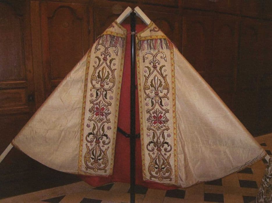 Chape fond crème damassé ; galon système rouge et or ; orfrois brodé de rinceaux en guipure rouge, or, vert ; chaperon frangé et brodé en quipure des lettres IHS dans un quadrilobe. Doublure cramoisie.