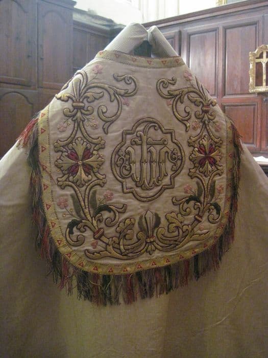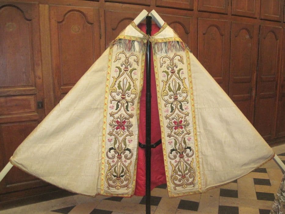Chape à fond crème damassé de larges ramages, galon système rouge et or ; large orfrois en broderie guipure de rinceaux feuillagés. Au revers sur le chaperon IHS dans un quadrilobe.