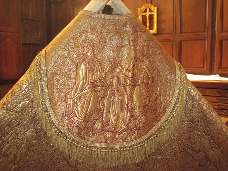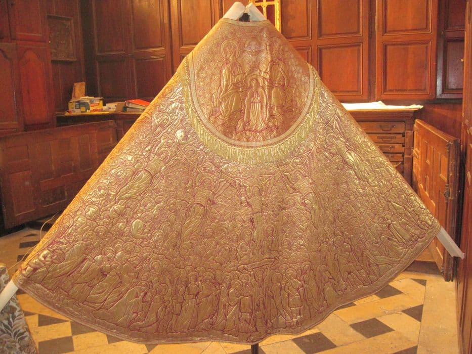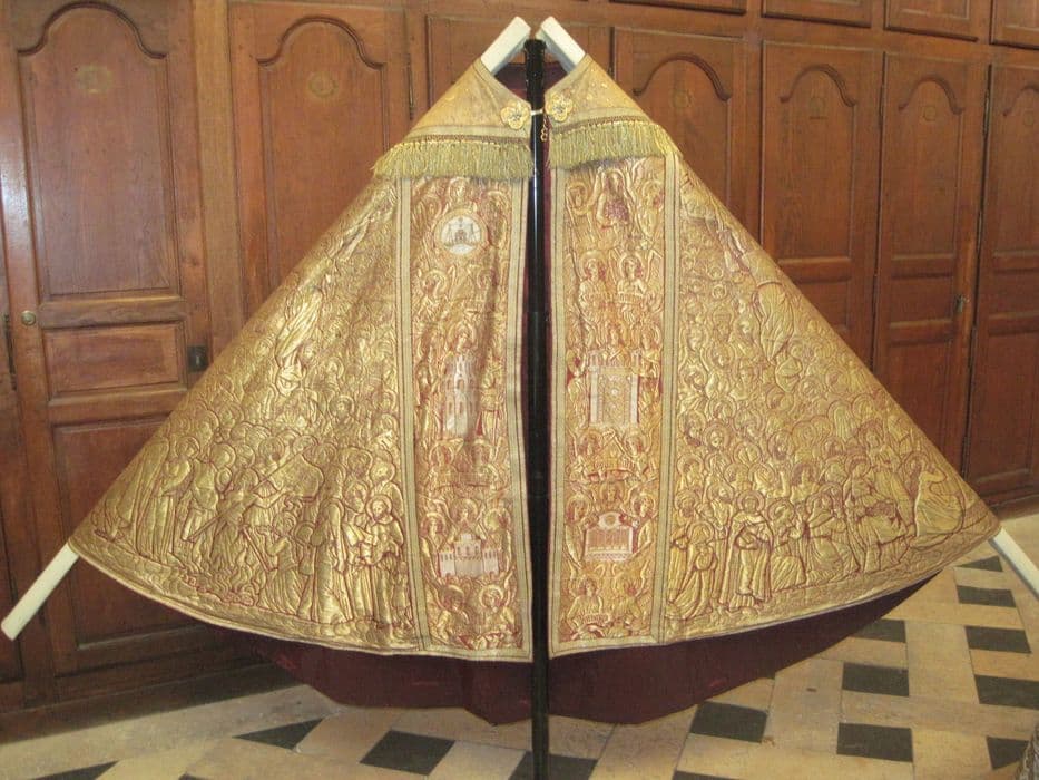 Soie, fils d'argent doré, laiton doré et émaux (fermail). Chape de la chapelle de Mgr Coullié, entièrement brochée de fils d'argent doré. Le fermail quadrilobé est orné d'une croix grecque émaillée. Doublure en soie rouge.