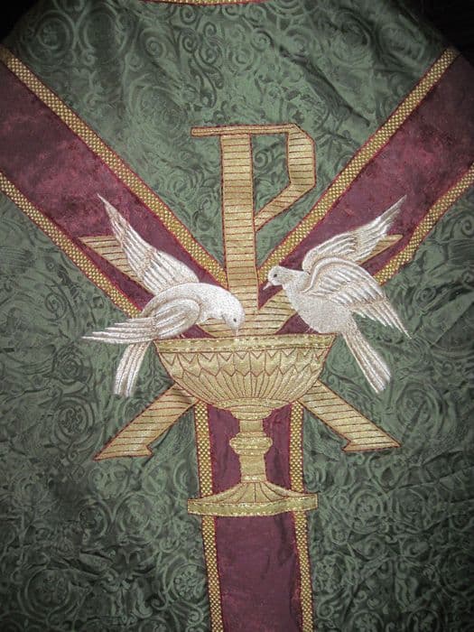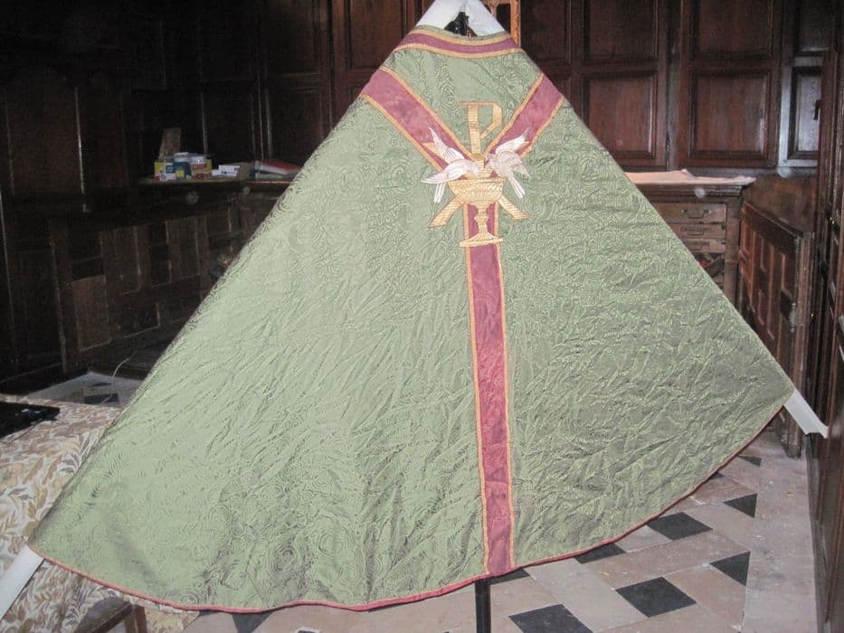 Chape à fond damassé vert à motifs de rinceaux ; orfrois en velours cramoisi et galon système doré ; fermail en laiton doré à motifs de quadrilobes ; sur le capuchon, colombe buvant dans un calice surmonté d'un P.