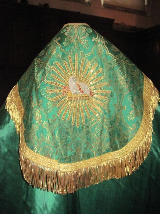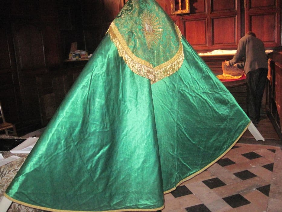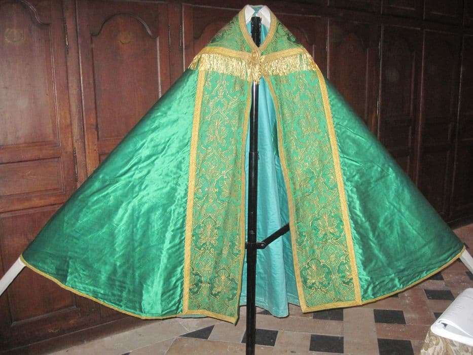 Chape fond satin vert ; orfrois damas vert et or ; capuchon broderie guipure fils métalliques agneau.