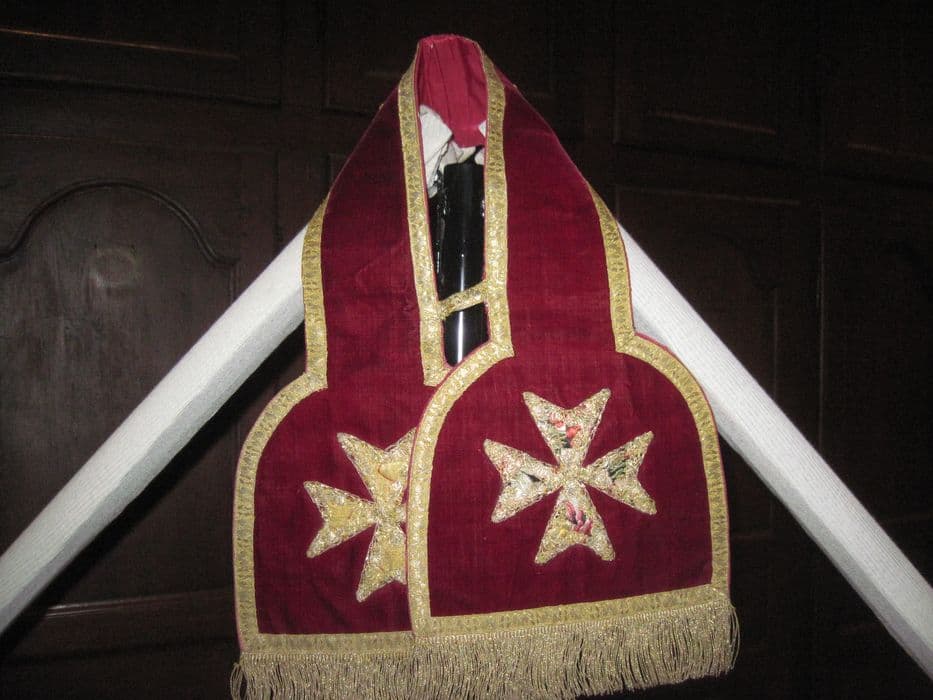 Fonds velours cramoisi ; galon système ; croix en lampas incrusté au crochet.