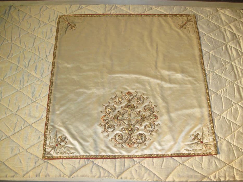 Voile de calice, fond soie crème, galon système or, broderie guipure fils métalliques rouge et or au passé empiétant, perles. Ensemble conservé dans sa boîte en bois.