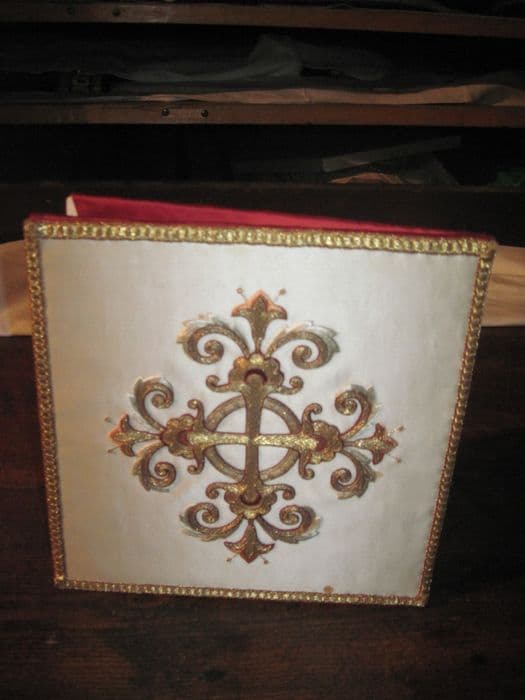 Bourse, fond soie crème, galon système or, broderie guipure fils métalliques rouge et or au passé empiétant, perles. Fond soie cramoisie. Ensemble conservé dans sa boîte en bois.