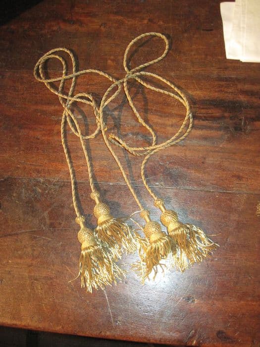 2 cordons en passementerie, s'achevant par deux glands à chaque extrémité, fils métalliques or. Dimension approximative.