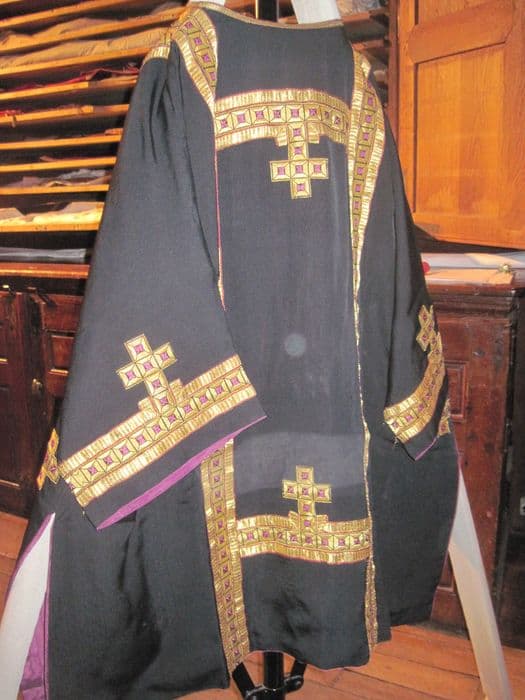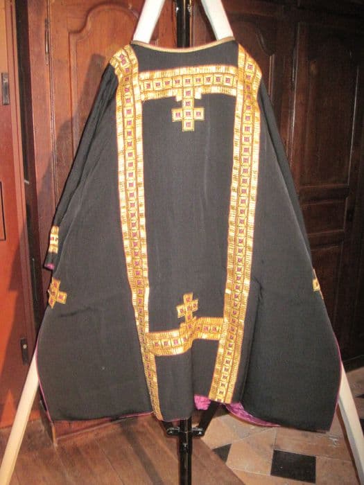 Tissu synthétique. 2 dalmatiques de deuil identiques, appartenant à un ornement en tissu noir, doublure violette, décor en galon système or rapporté formant orfrois et croix. Frange dorées et violette.