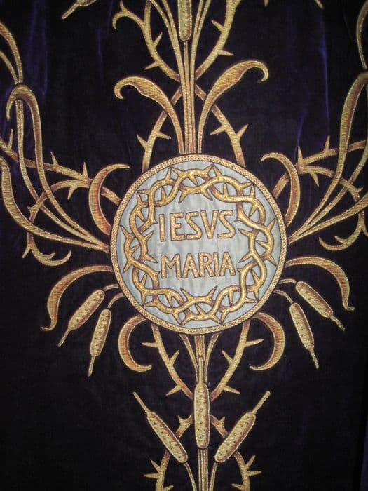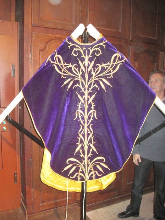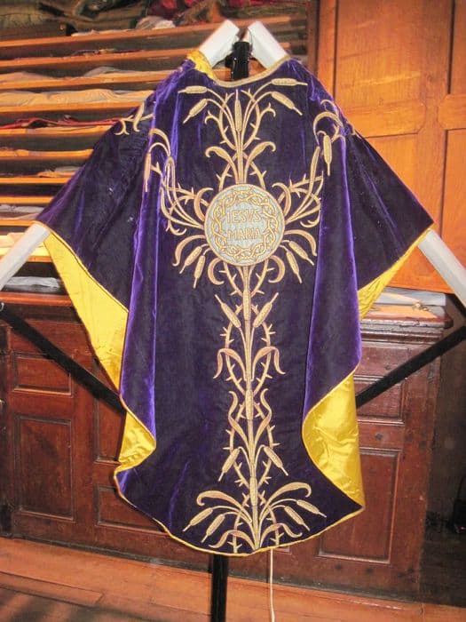 Chasuble velours violet, doublure jaune, broderies fils métalliques or à motifs de roseaux formant croix au dos et à la face, motif de couronne d'épine avec inscription Jésus Maria.
