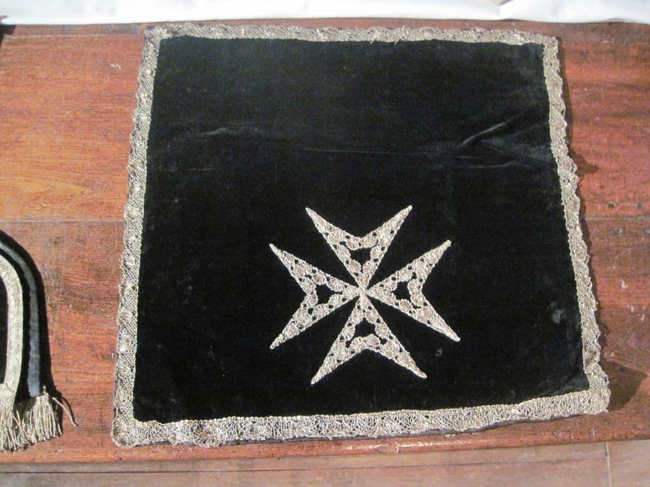 Voile de calice de deuil, fond velours noir, bordures et croix de Malte au centre en crochet de fils d'argent.