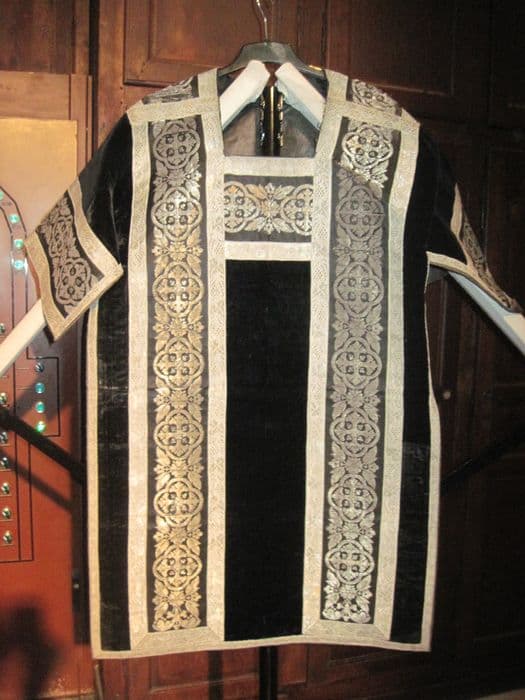 2 dalmatiques identiques, fond velours noir, orfroi de tissu brodé de quadrilobes et de feuillages, le tout en fils métalliques argent ; galons argent.