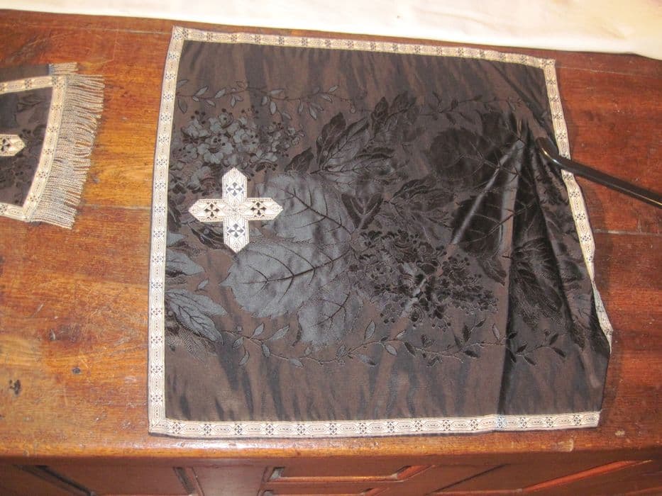 Voile de calice, fond satin brodé de feuillages au naturel et galons système argent néogothiques à motif de frise de losanges.