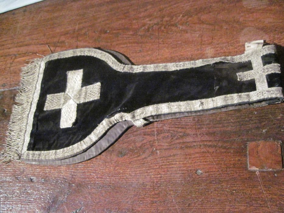 Manipule, fond velours noir, galon système et franges en fil métallique argent.
