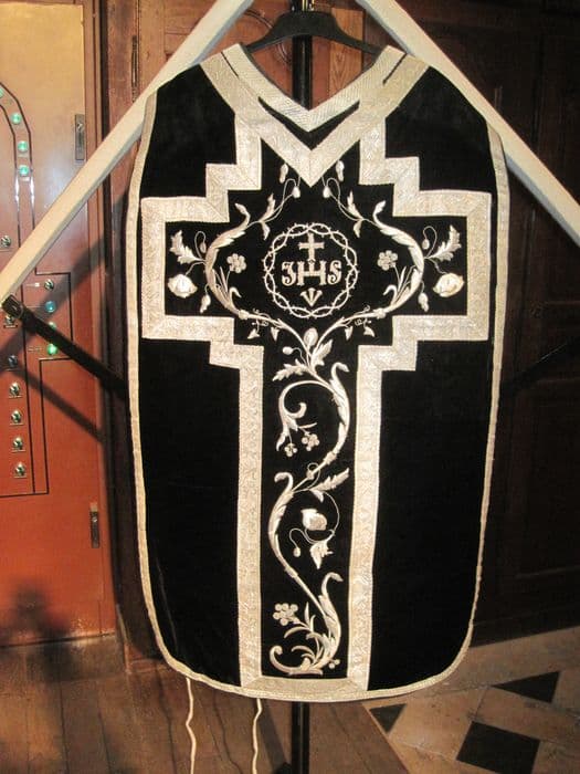 Chasuble fond velours noir, broderies guipure fils métalliques argent à motifs de rinceaux floraux, couronne d'épine encadrant les lettres IHS, galon système argent.