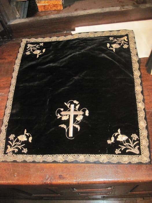 Voile de calice, fond velours noir, broderies guipure fils métalliques argent formant croix et motifs floraux ; bordure au crochet fils métalliques argent.