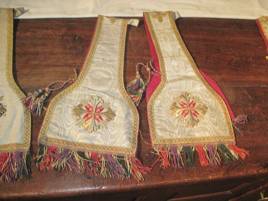 2 manipules formant une paire, à fond moiré ; sur les plats : croix en guipure or et rouge, galon système polychrome.