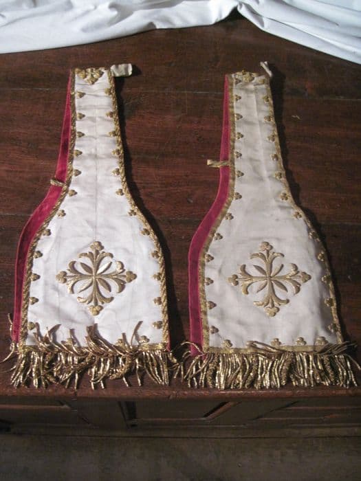 2 manipules identiques, fond gros de Tours crème, croix brodées sur les plats en guipure or, galon or relevé de trèfles guipure or.