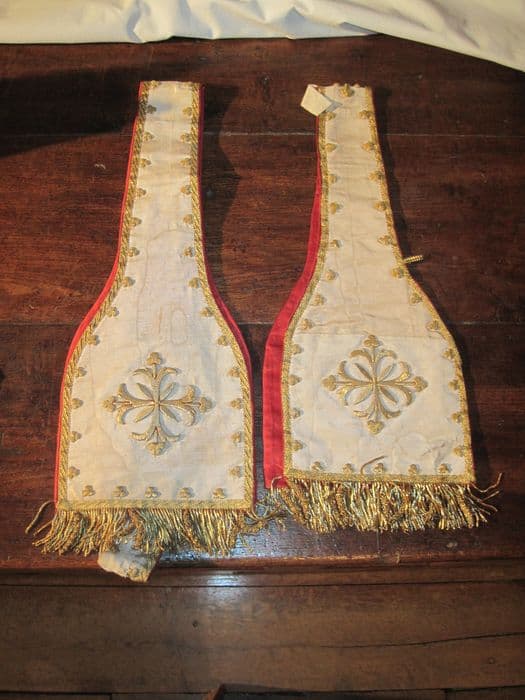 Paire de manipules, fond gros de Tours crème moiré, broderies guipure or à motif de croix feuillagées sur les plats, et de petits trèfles à trois feuilles sur le pourtour, galon système or, franges or, doublure cramoisie.